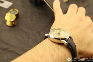 Just before World War II, Landeron developed the first cam actuated chronograph. Their Cal. 47 had three pushers: One to start, another to stop, and a third to reset the counter. They refined this movement to become the two-pusher Cal. 48. This would become one of the most popular chronograph movements ever made, with more than 3.5 million examples produced between 1937 and 1970. The lower price of production compared to a column wheel model meant an average person could afford a chronograph for the first time.