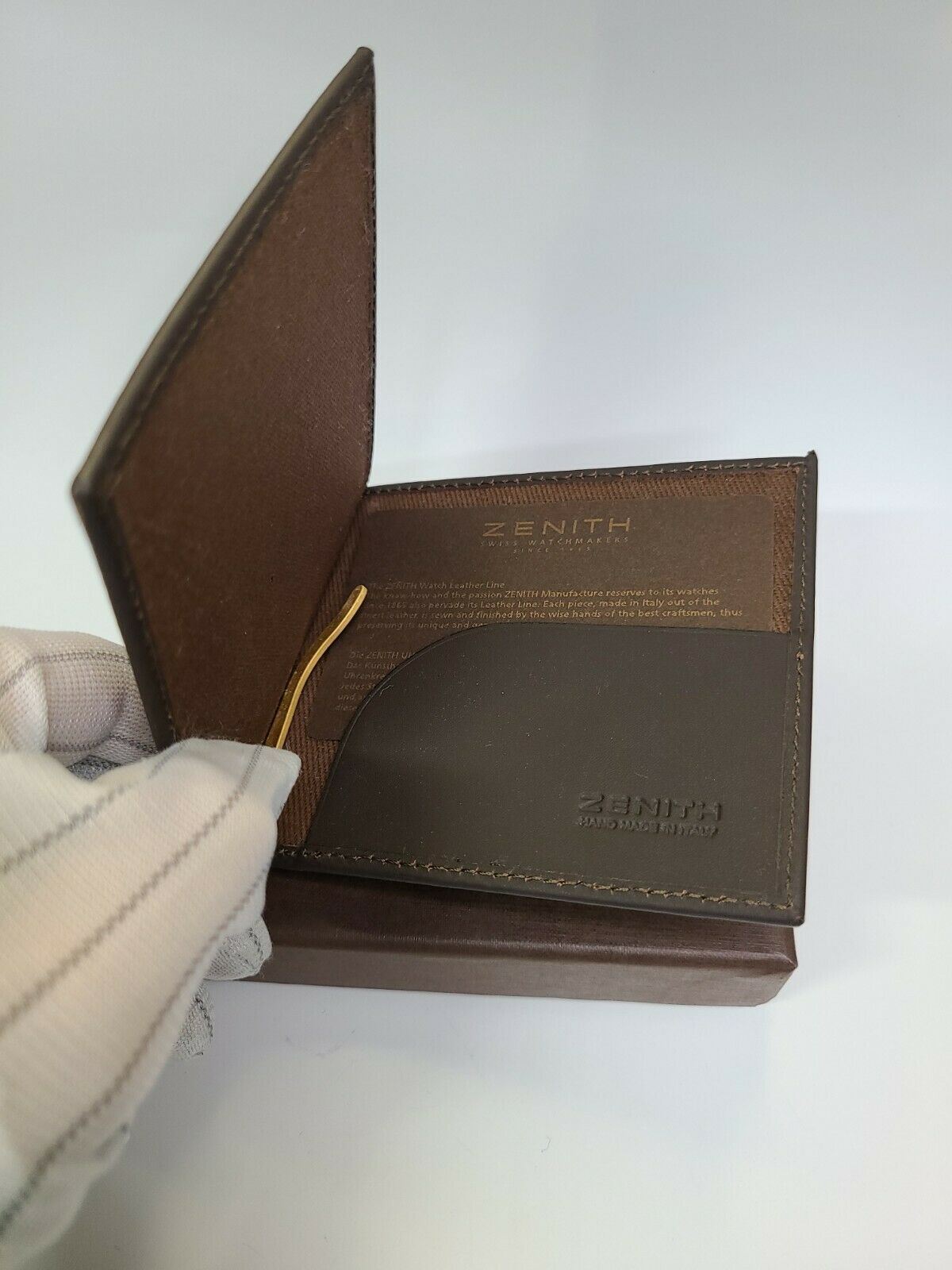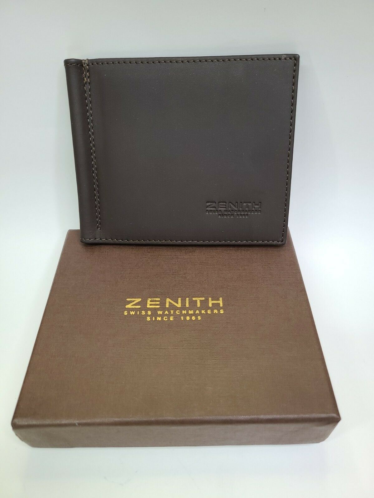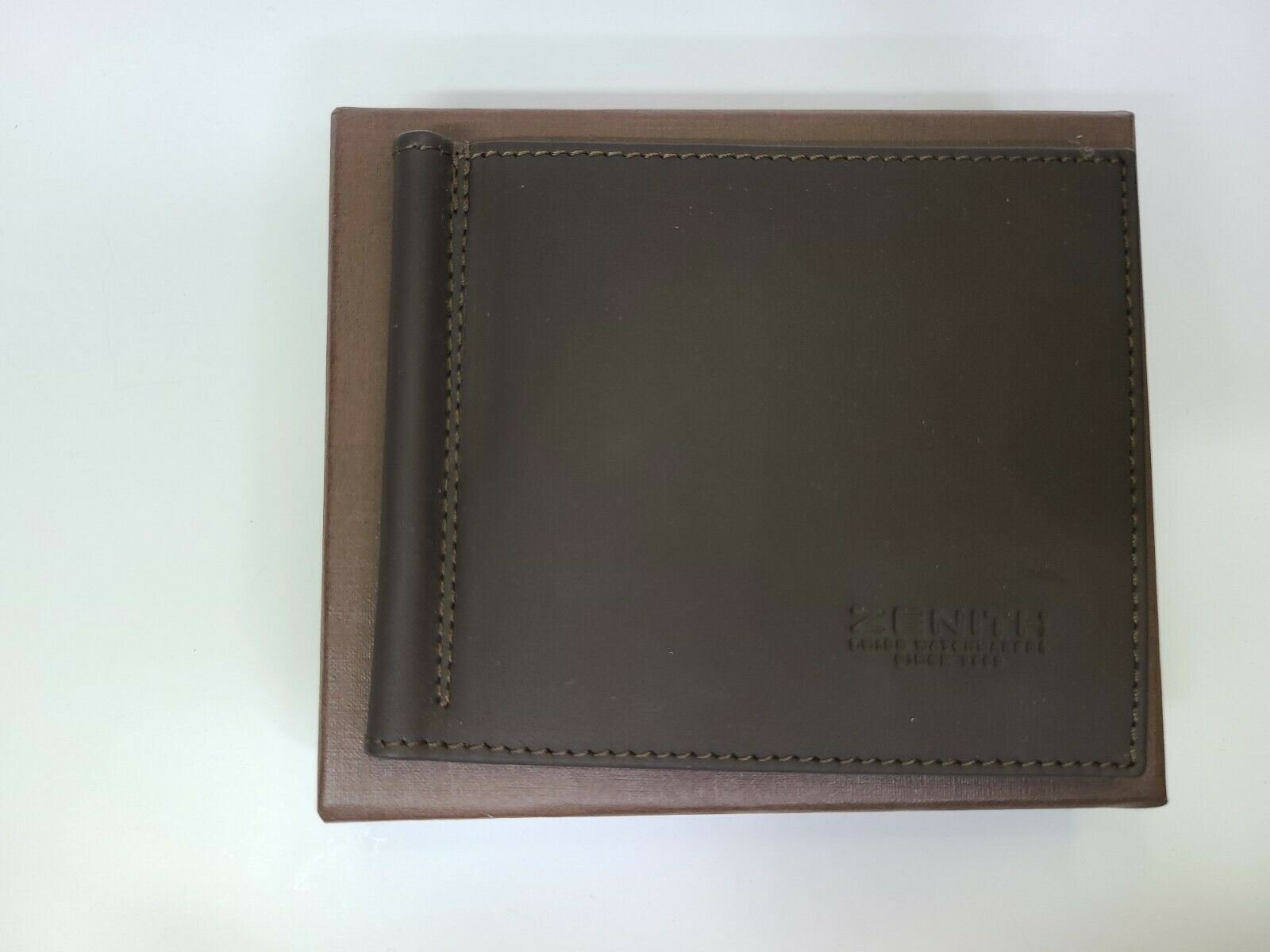 This is a New Zenith Swiss Watch Company Leather Money Clip Wallet, complete with original box and papers. Part of the Zenith Leather Line, this piece is Hand Made in Italy and crafted with the same attention to detail associated with the Zenith brand.