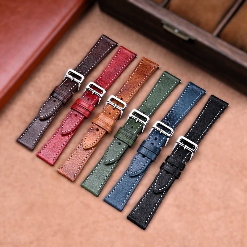 Please Note: Because this strap is crafted from naturally tanned full‑grain leather, slight variations in tone and surface character are normal. The way oils and waxes absorb into each hide can create subtle differences from piece to piece, and the appearance may shift depending on strap width, thickness, and lighting conditions. These natural variations are part of the material’s authenticity and ensure that each strap or band is unique.